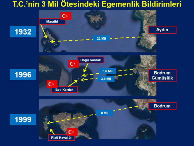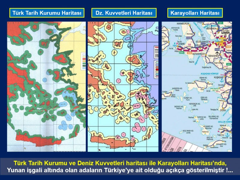Türk Tarih Kurumu ve Deniz Kuvvetleri haritası ile Karayolları Haritası’nda, Yunan işgali altında olan adaların Türkiye’ye ait olduğu açıkça gösterilmiştir.