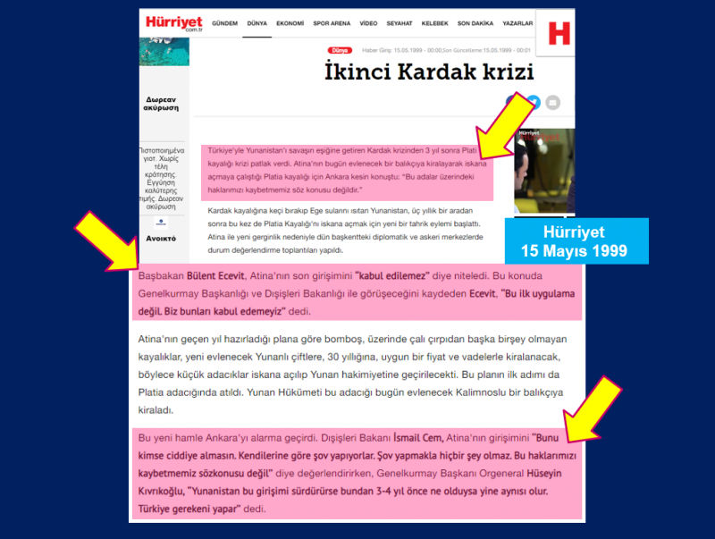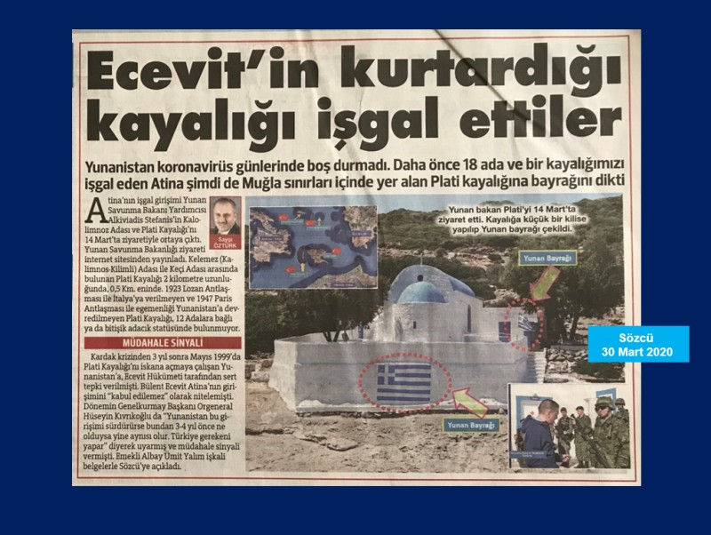 Türkiye’ye ait adalarda, 90’lı yılların ortalarından itibaren iskana açma çalışmaları yapan Yunanistan, 2004 yılı Ekim ve Kasım aylarında asker çıkararak adalarımızı fiilen işgal etmiştir. Misâk-ı Milli ve Türkiye Cumhuriyeti sınırları içinde